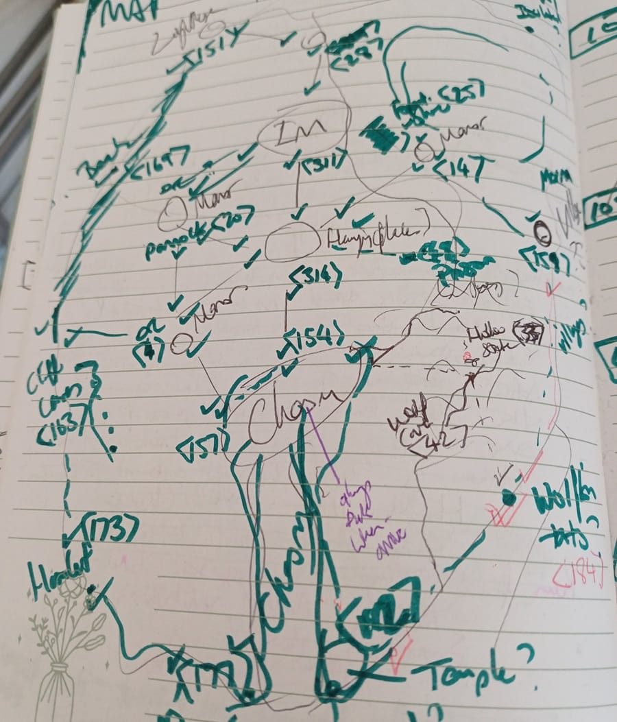 As readers of gamebooks, we often create our own maps of a gamebook. Where we've been, where to avoid, the correct pathway through. Or a litany of the dead characters where we've persisted in a tough gamebook, trying to succeed by the "rules as written". Maps of cartographers such as Qatlas (interview) provide guides to others on how to complete or navigate a gamebook.