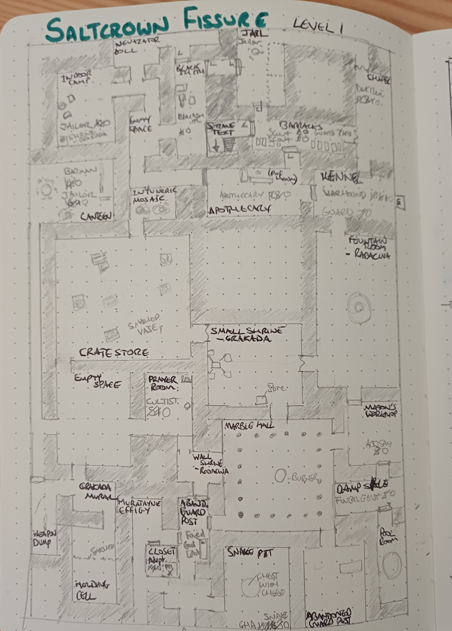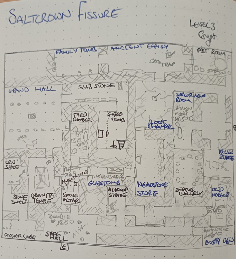 Back in Burrowbrook I recounted the tales of what I have seen in the entrance to Saltcrown Fissure. I've given a copy of my map so far to my family. If I fall then they may aid any who come after me.