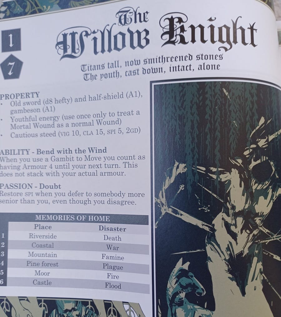 Then you roll or choose your Knight for each character, from a choice of 72. Each Knight gives you Property (usually including a weapon and steed), an unique Ability and a Passion (a way to restore lost Spirit). Each also has a pair of d6 tables giving something unique about the Knight (such as a Loyal Bird for the Talon Knight). Last is details of the Seer who knighted the character.